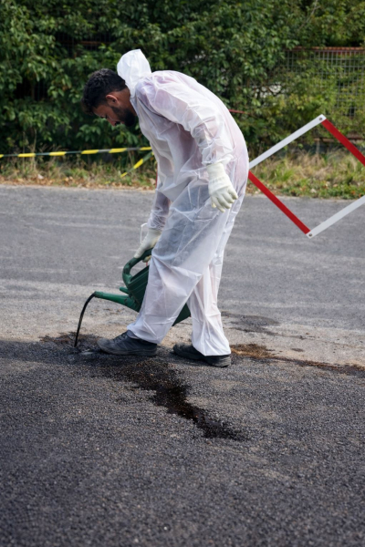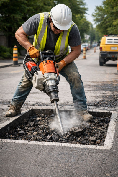 Első munkálati folyamat a kátyúk kijelölése jelölő spray-vel. Ezt követően azok mentén él vágást hajtunk végre vizezős nagyteljesítményű aszfaltvágóval. Végül a bontás következik.